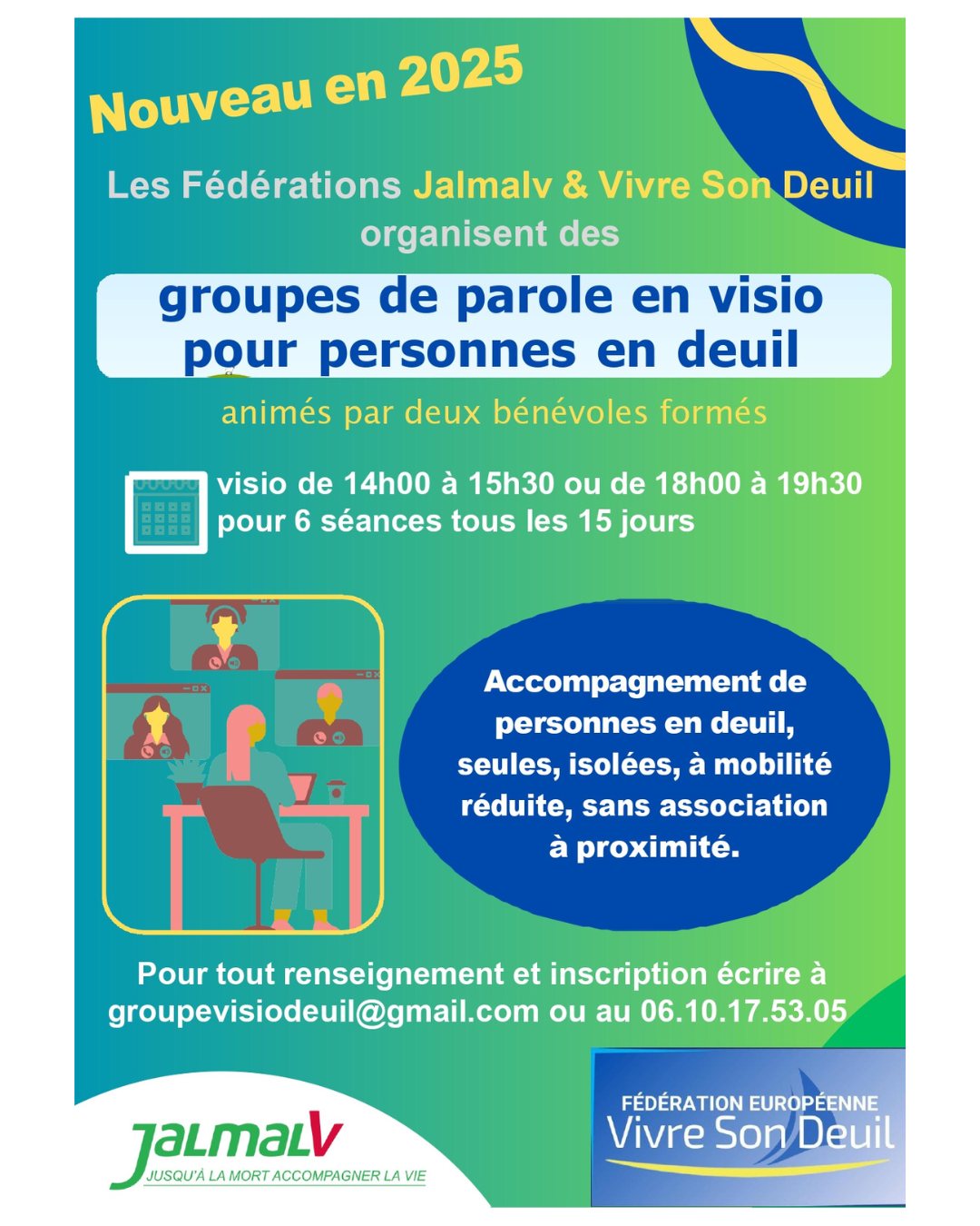 Les Fédérations Jalmalv et Vivre Son Deuil proposent, dès 2025, de nouveaux groupes de parole en visioconférence destinés aux personnes vivant un deuil et ne disposant pas d’un accompagnement proche de leur domicile.